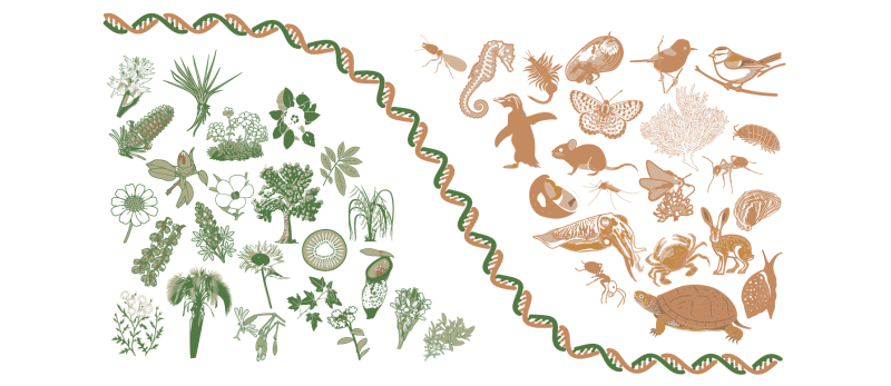 Photo bandeau haut de page : Représentation des clades étudiés (plantes en vert, animaux en brun). La courbe sigmoïde en forme d’ADN symbolise l’évolution de la probabilité d’échanges génétiques entre espèces, diminuant le long du continuum de divergence. © Camille Roux / EVO-ECO-PALEO